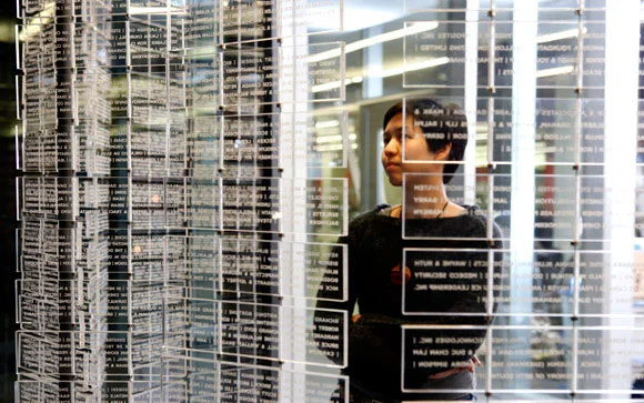 The semi-circle all-aluminum frame holds 14 columns of clear acrylic name plates. Each column is controlled by robotic servo motors which are attached on both ends. This allows the columns to rotate according to programmed animations. The top rail of the frame is also fitted with 11 sonar sensors for presence detection. As the viewer stands in front of the columns to read the names of the donors, the columns respond by turning towards the viewer. When no one is around, the columns turn and twist in pattern, as if they have a life of their own.